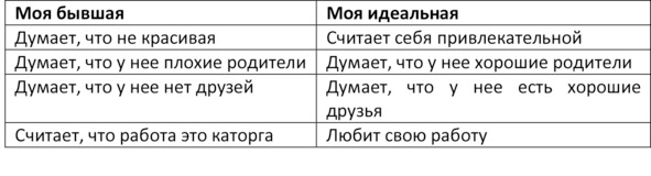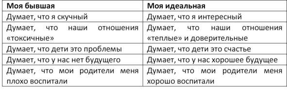 1. Напиши в столбик под названием «Моя бывшая» все мысли твоей бывшей, которые тебе не нравились: касающиеся тебя, ваших отношений, детей, совместного будущего, родителей и всего другого, наиболее важного для тебя.