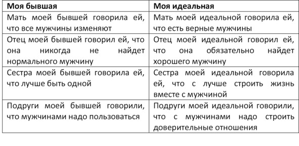 2. Во второй столбик под названием «Моя идеальная» напротив каждой мысли напиши, как бы ты хотел, чтобы эта мысль звучала, но только в отношении твоей будущей женщины. Например, если ты написал: «Мать моей бывшей говорила ей, что все мужчины изменяют», значит, во втором столбике напротив «мать моей бывшей говорила ей, что все мужчины изменяют» пиши: «Мать моей идеальной говорила ей, что есть верные мужчины».