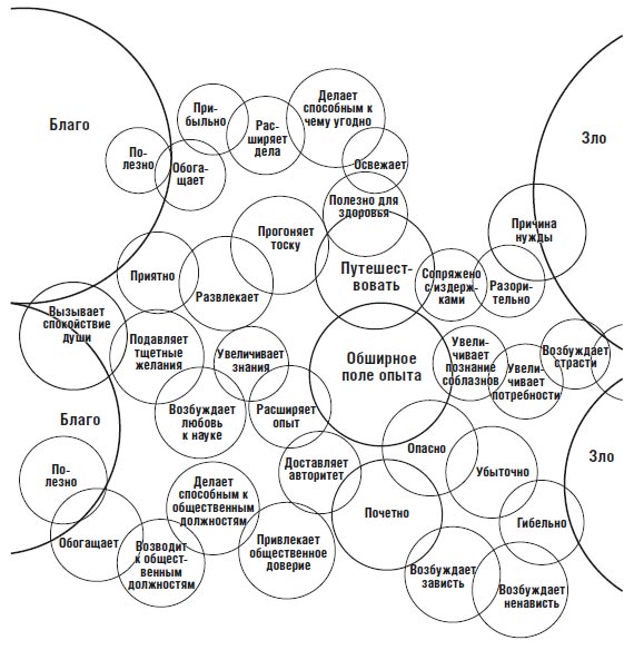 Правильные строгие умозаключения создаются путем тщательного наблюдения над сферами понятий, и только в том случае, если одна сфера вполне заключается в другой, а эта другая – в третьей, то и первая будет признана вполне содержащейся в третьей; в противоположность этому искусство убеждения (красноречие) основывается лишь на поверхностном наблюдении отношений между сферами понятий и их одностороннем определении в соответствии со своими целями. Это делается главным образом так: если сфера рассматриваемого понятия лишь отчасти заключается в другой, а отчасти принадлежит совершенно иной, то ее выдают за лежащую всецело в первой или всецело во второй, – смотря по цели оратора. Например, говоря о страсти, можно произвольно подводить ее под понятие величайшей силы, самого могущественного побудителя в мире или же – под понятие неразумения, а последнее – под понятие бессилия, слабости. Того же приема можно держаться постоянно, применяя его к каждому понятию, о котором идет речь. Почти всегда в сферу какого-нибудь понятия входят многие другие сферы, из которых каждая, заключая в себе некоторую долю области первого понятия, сама сверх того простирается еще далее; оратор же из этих последних сфер понятий освещает только ту одну, под которое он хочет подвести первое понятие, оставляя прочие без внимания или прикрывая их. На этой уловке и основываются, собственно, все приемы красноречия, все более тонкие софизмы, ибо логические софизмы, как mentiens[24], velatus[25], cornutus[26] и т. п., очевидно, слишком грубы для действительного пользования. Так как мне неизвестно, чтобы кто-нибудь до сих пор свел сущность всей софистики и красноречия к этому последнему основанию их возможности и показал его в специфическом свойстве понятий, т. е. в познавательных приемах разума, то, коль скоро мое изложение уже привело меня к этому вопросу, я позволю себе уяснить его, как бы ни был он понятен сам собою, еще посредством схемы на прилагаемой таблице: из нее видно, как сферы понятий многообразно захватывают одна другую и вполне допускают поэтому произвольный переход от одного понятия к другому. Я не хотел бы только, чтобы из-за таблицы этому маленькому и побочному исследованию придали больше значения, чем оно заслуживает по своему характеру. Пояснительным примером я избрал понятие путешествия.