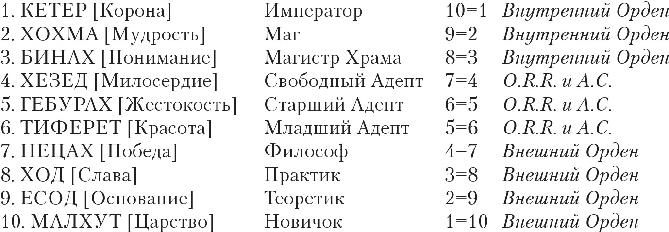 Иерархическая структура «Золотой Зари», таким образом, была идентична S.R.I.A., но отличалась тем, что назначения высших иерархов в ней происходили выборным путем, начиная со степени Императора до глав отдельных лож. Десять степеней (градусов) были разделены на три ордена: Орден «Золотой Зари», или Внешний Орден, включающий четыре степени, от Новичка до Философа; Орден Алой Розы и Альфа Креста (O.R.R. или А.С.), включающий три степени Адептов; и Первый Орден, или Внутренний Орден, который относился к высшим степеням Магистра Храма и Мага, принадлежащим Главам Ордена, и Императора – титулом, соотносящимся с «Короной» дерева Сефирот.