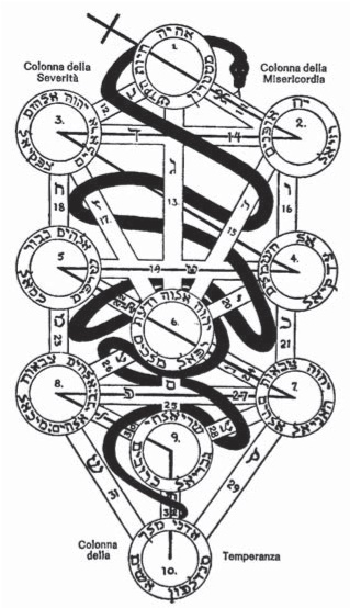 Согласно доктрине, практиковавшейся во французских и английских оккультных школах, Вселенная и Бог отражаются в Дереве Сефирот, символизируемых Деревом Познания Добра и Зла в Небесном Эдеме. В Золотой Заре через это проявлялась идея: человеческая душа может возвратиться в Эдем, совершая путь по ветвям Дерева, которые идентифицировались с Арканами Таро. Первородный Змей символизирует силу, препятствующую в достижении Высшей Короны, которую необходимо побороть, чтобы продолжить длинный путь восхождения.