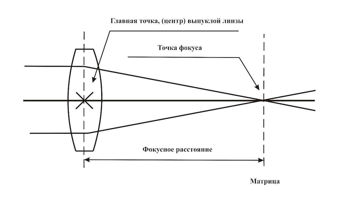 Несмотря на то, что объектив состоит из групп линз, условно представим его как одну выпуклую линзу (собирающую), чтобы уточнить термин фокусное расстояние. Оно определяется расстоянием между центром этой линзы и точкой фокуса (плоскость матрицы). Фокусное расстояние объектива определяется при фокусировке на «бесконечность».