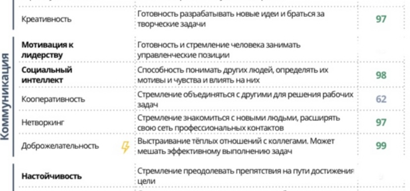 Тест PIF – это многочасовое сложное тестирование, которое применяют организации при найме, позволяющее определить профпригодность, компетентность человека и показывает, насколько та или иная предрасположенность у человека развита сильнее (в процентах), чем у 4000 испытуемых, участвовавших в создании теста. Опубликую лишь те данные, что могут быть подтверждающим показателем в той или иной мере по теме, о которой пишу.