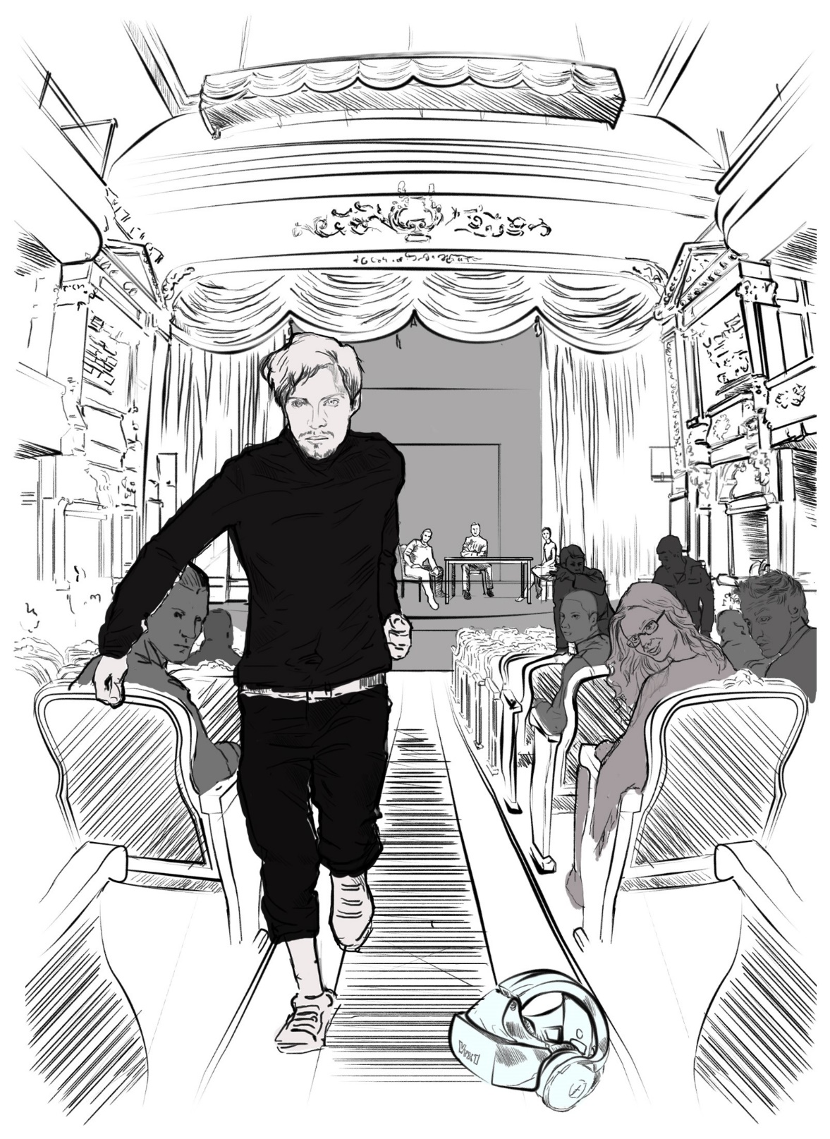 Двое охранников, пробиравшиеся через ряды, заставили провокатора прерваться. Он ринулся в сторону другого выхода. Охранники продолжали преследование, спотыкаясь об колени гостей. Беспроводной микрофон позволял вещать прямо на ходу:
