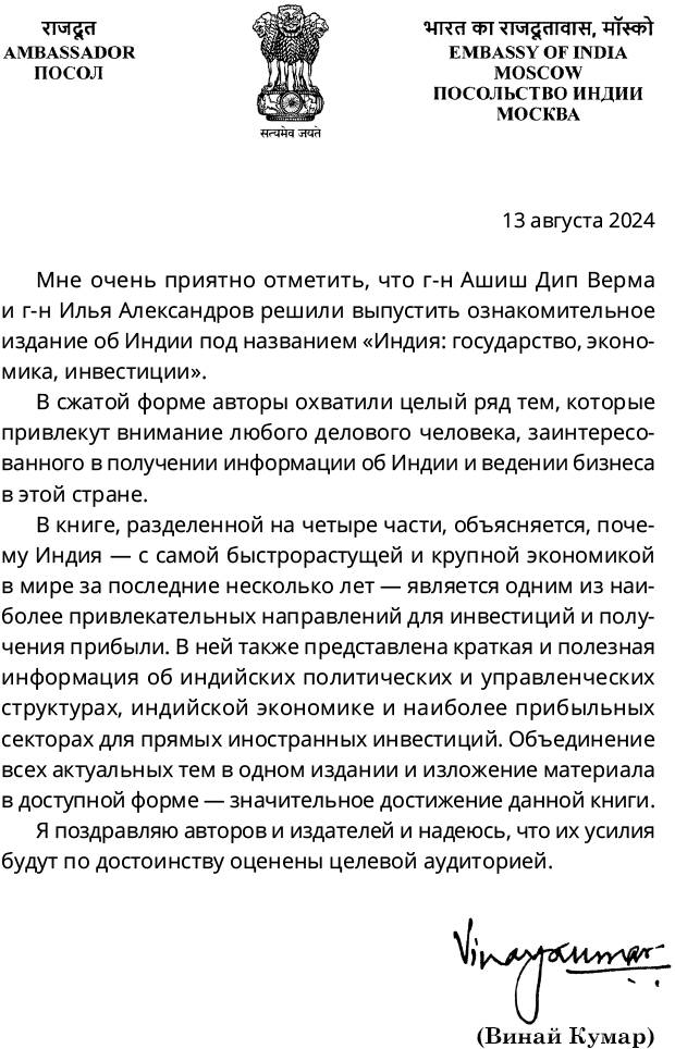 От души приветствую всех, кто интересуется Индией, и желаю вам, вдохновившись книгой, внести личный вклад в преобразование практических деловых отношений двух старых друзей в новую реальность между ними.