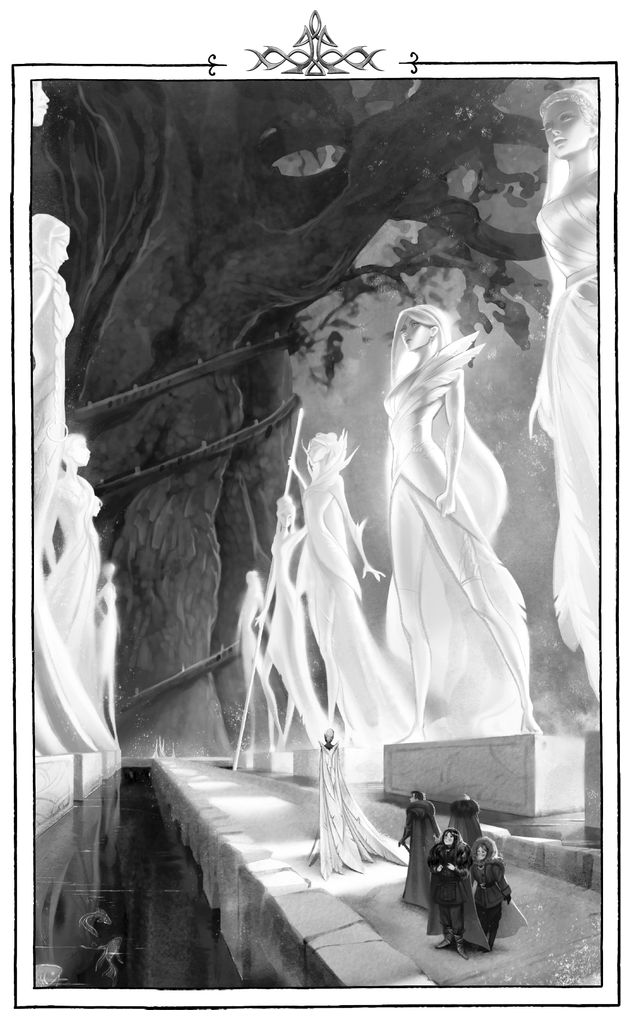 Она переступила порог, и каждая статуя потянулась к той, что стояла напротив, образуя подобие тоннеля. Едва их пальцы соприкоснулись, вода моментально застыла, и от ног Нары к острову перекинулся ледяной мост.