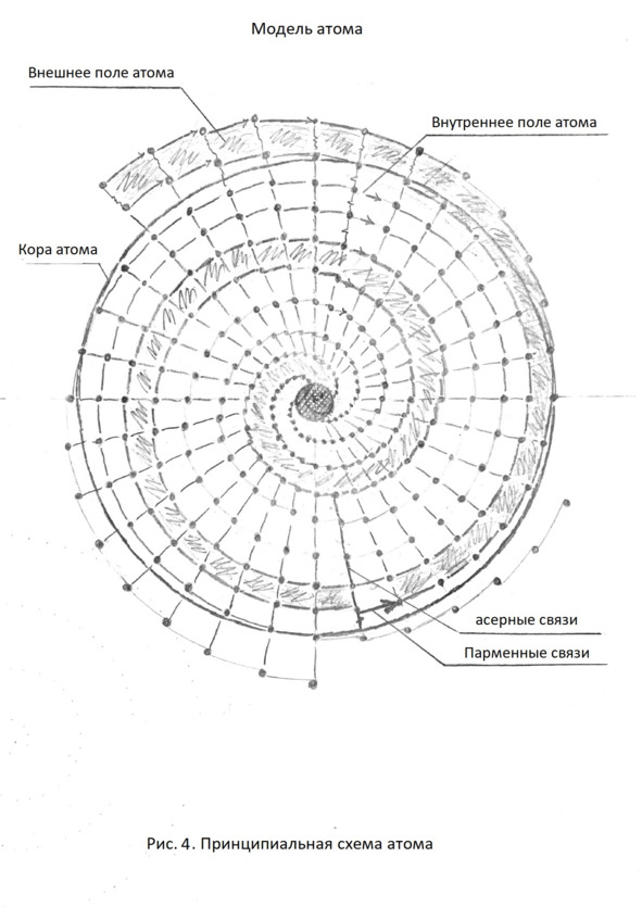 Пармен двигает амионы в поперечном направлении (по касательным), асер делает поправку орбит гравитонов, направляя паутину на центр. Свободные амионы (СА) вовлекаются в общую круговерть, увлекаемые паутиной. СА находятся в складках силовых линий, но у них есть своя роль, позднее из них образуются планеты и спутники. В составе гравитационной сети, гравитоны движутся по нисходящей траектории, подобной обратной спирали Архимеда. В итоге гравитоны нагнетают материю на центр, где образуют ядро большого атома (рис. 4).