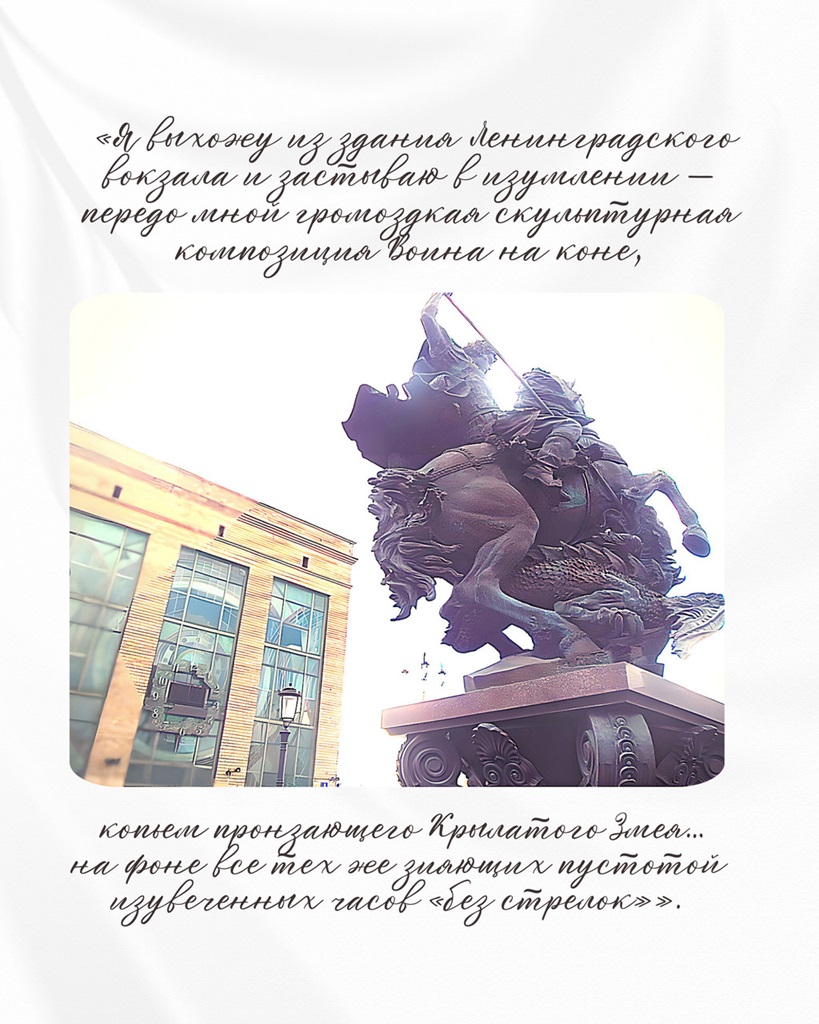 Я выхожу из здания Ленинградского вокзала и застываю в изумлении – передо мной громоздкая скульптурная композиция Воина на коне, копьем пронзающего Крылатого Змея… на фоне все тех же зияющих пустотой изувеченных часов «без стрелок».
