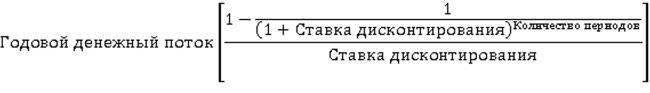 Аннуитет – это постоянный денежный поток, который происходит через равные промежутки времени в течение фиксированного периода. Хотя текущую стоимость такой группы потоков можно вычислить как сумму всех отдельных дисконтированных денежных потоков, также будет справедлива следующая формула: