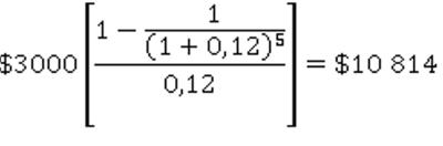 Для иллюстрации предположим, что у вас есть выбор: купить автомобиль за $10 000 наличными или пять лет платить в рассрочку по $3000 в конце каждого года. Если ставка дисконтирования составляет 12 %, текущая стоимость оплаты в рассрочку равна: