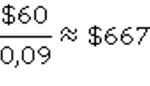Стоимость бессрочной облигации, по которой каждый год выплачивается купон в размере $60, при процентной ставке 9 % рассчитывается так: