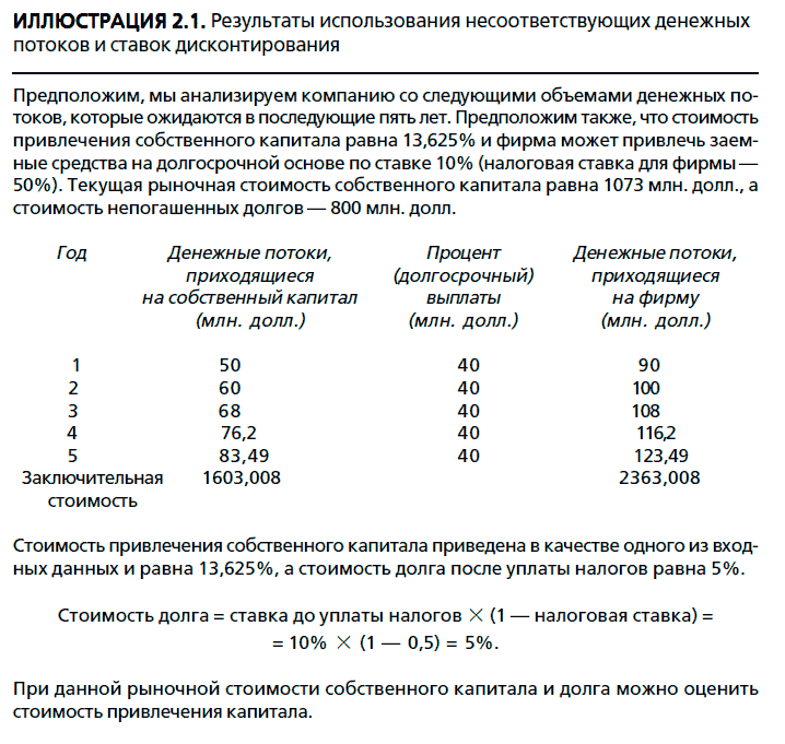 Хотя эти три подхода используют разные определения денежных потоков и ставок дисконтирования, они создают согласующиеся между собой оценки стоимости до тех пор, пока используется тождественный набор допущений, сделанных при оценке. Главная ошибка, которой следует избегать, заключается в использовании несопоставимых показателей денежных потоков и ставок дисконтирования, поскольку дисконтирование денежных потоков на собственный капитал по ставке дисконтирования, равной стоимости капитала, приведет к завышенной оценке собственного капитала. Дисконтирование же денежных потоков, приходящихся на фирму, по ставке дисконтирования, равной стоимости собственного капитала, приведет к завышенной оценке фирмы. Иллюстрация 2.1 показывает тождественность оценки собственного капитала и оценки фирмы. В главе 15 мы покажем, что модели оценки фирмы и скорректированной приведенной стоимости дают сходные значения стоимости.