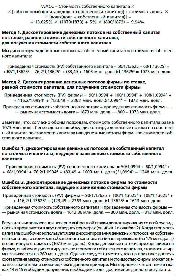 ПРОСТОЙ ТЕСТ ДЛЯ ДЕНЕЖНЫХ ПОТОКОВСуществует простой тест, который можно использовать для определения, являются ли используемые для оценки денежные потоки поступлениями на собственный капитал или на фирму. Если дисконтируются денежные потоки после выплаты процентов и основных платежей, то речь идет о денежных потоках на собственный капитал и в качестве ставки дисконтирования должна использоваться стоимость собственного капитала. Если же дисконтируются денежные потоки до уплаты процентов и основных платежей, то обычно речь идет о денежных потоках, поступающих в фирму. Излишне напоминать, что есть и другие нюансы, которые следует учитывать при оценке данных денежных потоков. Они будут рассмотрены детально в последующих главах.