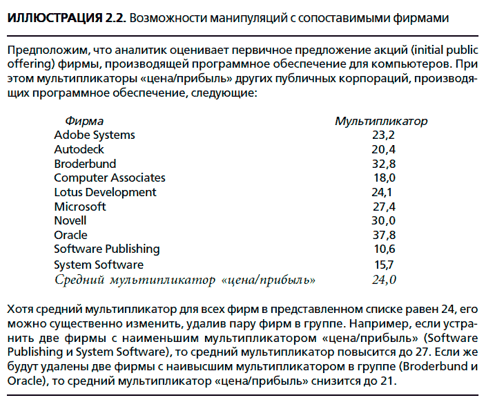 Равным образом мультипликаторами легко манипулировать и злоупотреблять, особенно когда используются сопоставимые фирмы. Учитывая то, что не существует двух фирм, которые были бы совершенно одинаковыми в отношении показателей роста и риска, выявление сопоставимых фирм становится субъективным делом. Следовательно, предвзятый аналитик может выбрать группу сопоставимых фирм для подтверждения своих предубеждений относительно стоимости какой-то фирмы. Иллюстрация 2.2 представляет пример подобного рода. Хотя возможности для предвзятости существуют и в случае оценки дисконтированных денежных потоков, пользующийся данным методом оценки аналитик вынужден быть более открытым в части своих допущений, определяющих заключительную стоимость. При использовании мультипликаторов указанные допущения часто оказываются скрытыми.