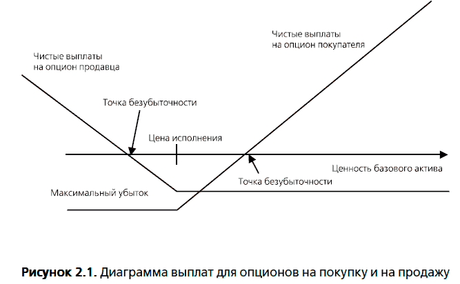 Рисунок 2.1 иллюстрирует выплаты по опционам продавца и покупателя в качестве функции стоимости базового актива. Стоимость опциона можно оценить как функцию таких переменных, как приведенная стоимость, дисперсия стоимости базового актива, цена исполнения опциона, время до истечения срока опциона, а также безрисковая процентная ставка. Впервые формула ценообразования опциона была выведена Фишером Блэком и Майроном Шоулзом (Fisher Black and Myron Scholes) в 1972 г., позднее она была последовательно расширена и детализирована и сейчас представлена во множестве версий. Хотя модель ценообразования опционов Блэка-Шоулза (Black-Sholes option pricing model – BSOPM) игнорировала дивиденды и предполагала, что опционы не подлежат исполнению раньше срока, ее можно модифицировать для учета обеих возможностей. Свой вклад в развитие линии моделей, предназначенных для оценки опционов, внесли также: версия с дискретным временем, биномиальная модель ценообразования для опциона и прочие модели.