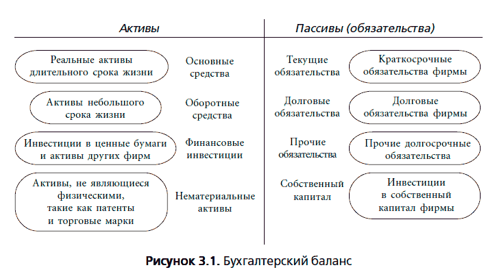 Существуют три вида бухгалтерской отчетности, которые представляют обобщенную информацию о фирме. Первый – это бухгалтерский баланс (balance sheet) (см. рисунок 3.1), в котором суммируются активы, принадлежащие фирме, стоимость данных активов, а также их источники (обязательства и собственный капитал), используемые для финансирования данных активов в определенный момент времени.