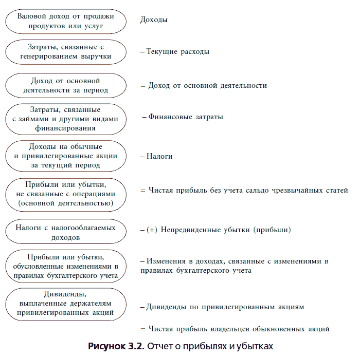 Затем следует отчет о прибылях и убытках (income statement) (см. рисунок 3.2), который дает информацию относительно доходов и затрат фирмы, а также информирует об итоговом доходе фирмы за определенный период. Этот период может быть равен кварталу (в случае квартального отчета о прибылях и убытках) или году (в случае годового отчета).
