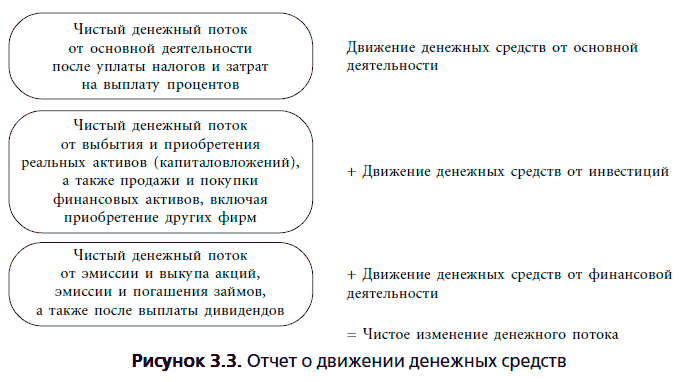 И наконец, существует отчет о движении денежных средств (statement of cash flow) (см. рисунок 3.3), определяющий источники и использование денежных средств фирмы от основной деятельности, инвестиций и финансовой активности за отчетный период. Отчет о движении денежных средств можно рассматривать в качестве попытки детализировать движение денежных средств, а также как попытку ответить на вопрос, почему кассовый остаток менялся в течение данного периода.