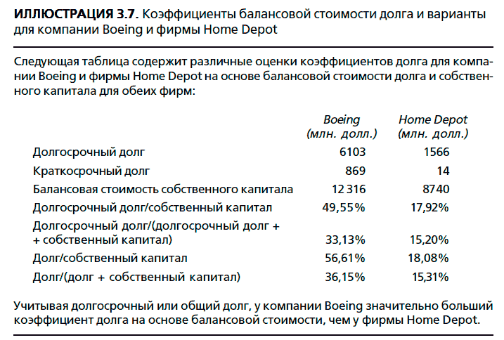 Первый коэффициент измеряет долг как долю в общей сумме капитала фирмы; он не может превышать 100 %. Второй коэффициент измеряет долг как долю в балансовой стоимости собственного капитала фирмы, и его можно легко вывести из первого коэффициента:
