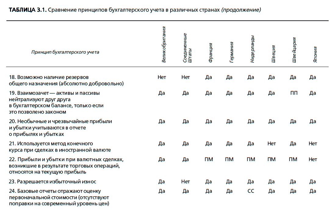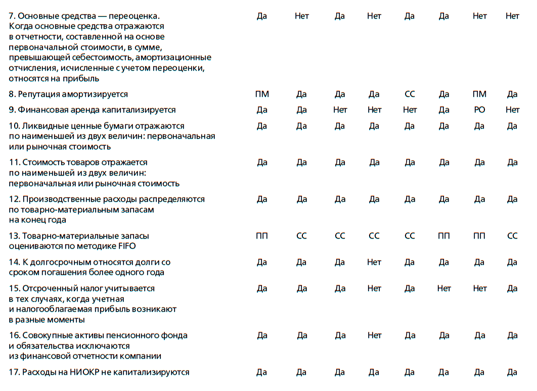 Самые сильные отличия от США наблюдаются в двух странах – Германии и Японии. Основные отличия следующие: во-первых, компании в Соединенных Штатах, как правило, ведут финансовую и налоговую отчетность раздельно, что порождает такие пункты в отчетах, как отсроченные налоги, призванные покрыть разницу между двумя линиями отчетности. Следовательно, методы начисления износа в финансовых отчетах, по всей вероятности, будут ускоренными, а потому приведут к сокращению заявленной прибыли. Во-вторых, требование капитализации аренды и представления ее в качестве обязательства в Соединенных Штатах носят характер значительно большей принудительности. В Японии аренда рассматривается, как правило, как операционная аренда и не отображается на стороне пассивов в бухгалтерском балансе. В Германии фирмы могут капитализировать аренду, однако по сравнению с американскими компаниями, они обладают большей свободой при классификации ее как операционной аренды или капитальной аренды. В-третьих, однажды созданная репутация может амортизироваться в течение 40 лет в США и в течение гораздо меньшего срока в Германии и Японии, что также приводит к уменьшению прибыли. В-четвертых, в США резервы можно создавать только для специальных целей, в то время как в Японии и Германии компании могут использовать общие резервы для выравнивания прибыли, полученной в различные периоды, что приводит к занижению прибыли в удачные годы и к завышению – в неудачные.