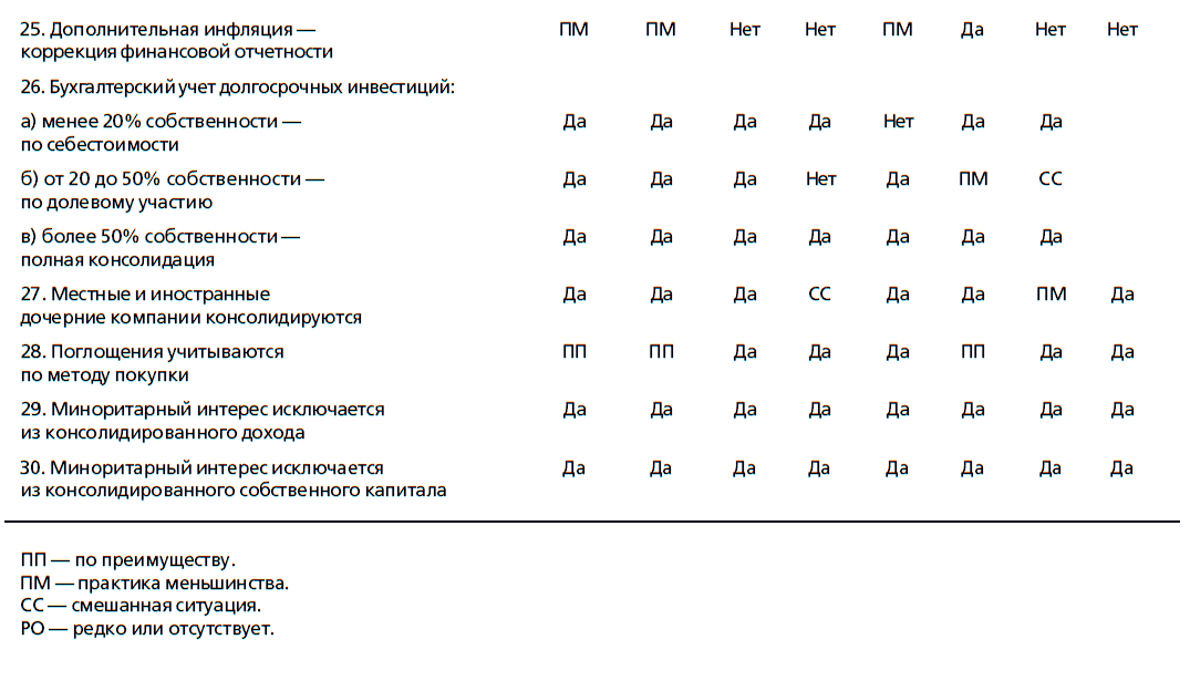 Различия в стандартах бухгалтерского учета между разными странами влияют на измерение прибыли. Тем не менее эти различия не столь велики, как кажется некоторым аналитикам, и они не могут оправдать существенные отклонения от фундаментальных принципов оценки[22]. Чои и Левич (Choi and Levich) в своем обзоре бухгалтерских стандартов на различных рынках за 1990 г. отметили, что большинство стран при ведении бухгалтерского учета придерживаются принципов неизменности методов учета, признания доходов по реализации и учета по первоначальной стоимости. Таблица 3.1 суммирует бухгалтерские стандарты, действующие на восьми ведущих финансовых рынках, и показывает, что сходства в значительной степени превышают различия.