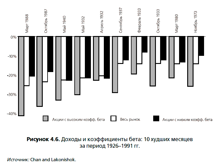Фама и Френч (Fama and French, 1992) исследовали связь между коэффициентами бета и доходами за период 1963–1990 гг. и пришли к заключению, что корреляция между ними отсутствует. Эти результаты вызвали возражения по трем аспектам. Во-первых, Амихуд, Кристенсен и Мендельсон (Amihud, Christensen and Mendelson, 1992), которые использовали те же самые данные, но применяли другие статистические тесты, показали, что различия в коэффициентах бета фактически объясняют разницу в доходах за данный период. Во-вторых, Котари и Шанкен (Kothari and Shanken, 1995) оценили коэффициенты бета, используя при этом данные за год, а не за более короткие периоды времени, применяемые во многих тестах, и пришли к выводу, что коэффициенты бета объясняют в определенной пропорции различия между инвестициями. В-третьих, Чан и Лаконишок (Chan and Lakonishok, 1993) проанализировали временные ряды доходов за существенно более длительный период (1926–1991 гг.) и выявили положительную корреляцию между коэффициентами бета и доходами, которая была нарушена только в период после 1982 г. Они также обнаружили, что коэффициенты бета являются полезным инструментом для изучения риска в экстремальных рыночных условиях. При этом фирмы, связанные с наибольшим риском (10 % с наивысшим коэффициентом бета), функционируют куда менее эффективно, чем рынок в целом в течение 10 наихудших месяцев для рынка в период между 1926–1991 гг. (рисунок 4.6).
