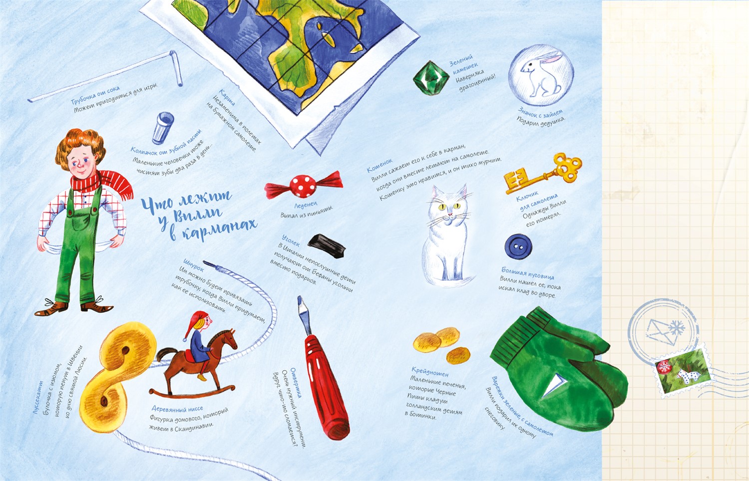 Больше всего на свете он любит находить интересные вещи и складывать их в карманы. Дома его так и зовут – Вилли Большие Карманы. В них у него хранятся несметные сокровища – крышечка от зубной пасты, шнурок, большая пуговица, ключ неизвестно от чего, зеленый камешек, трубочка от сока и значок с зайцем».