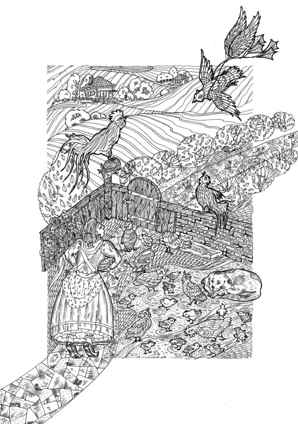 She flew around many farms looking for him, but without success. The Hen was tired, but she kept trying, until finally one day she landed in some barnyard.