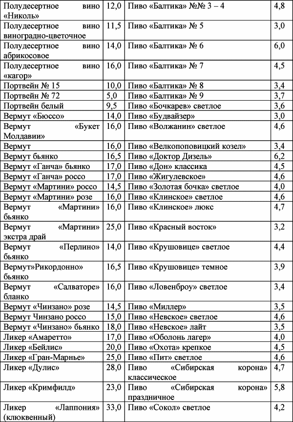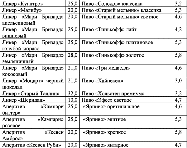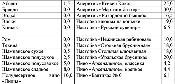 Сколько «стоят» алкогольные напитки вам будет нетрудно подсчитать, используя данные следующей таблицы: