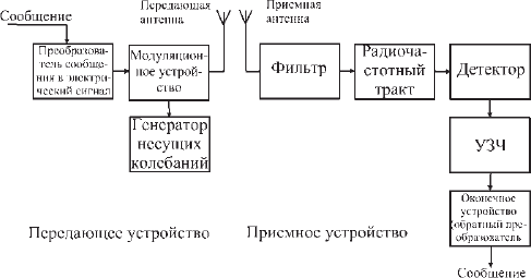 Передачу сообщений с помощью электромагнитных волн с относительно узкой шириной спектра можно осуществить, если подвести усиленный сигнал к передающей антенне, которая создаст в окружающем пространстве электромагнитную волну. Достигнув приемной антенны, волна возбудит в ней электромагнитные колебания, спектральный состав которых такой же, как у сигнала сообщения.