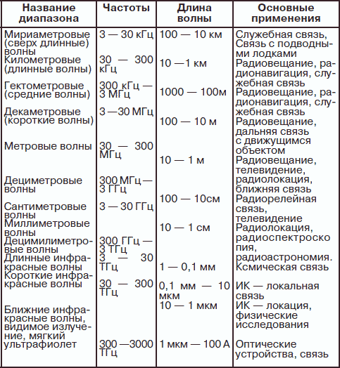 Существует определенная классификация диапазонов несущих частот. В таблице 1.1 приведено распределение радиочастот по диапазонам согласно ГОСТу 24375-80 и указаны области их технического применения.