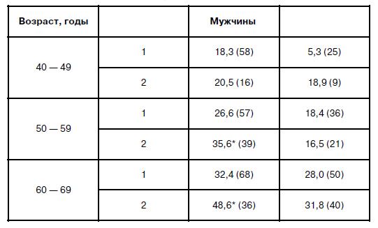 Таблица 1. Площадь возвышающихся поражений в коронарных артериях при благоприятном (1) и неблагоприятном (2)наследственно – семейном анамнезе в отношении сердечно – сосудистых заболеваний