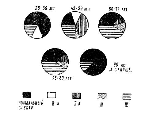 Оказалось, что для них характерны: низкий уровень общего холестерина b-холестерина и более высокая доля l-холестерина, который, как известно, обладает «защитным» действием против атеросклеротического процесса. С точки зрения преобладания в разные периоды возраста определенных типов гиперлипидемий, как видно из рисунка (рис. 2) наиболее атерогенные типы: На; Нб; и IV преобладают в 5–7 десятилетиях, у лиц же 8—9-го десятка и старше увеличивается частота гиперлипидемий, не способствующих атерогенезу, что, видимо, обусловливает доживание этих лиц до старческого возраста.