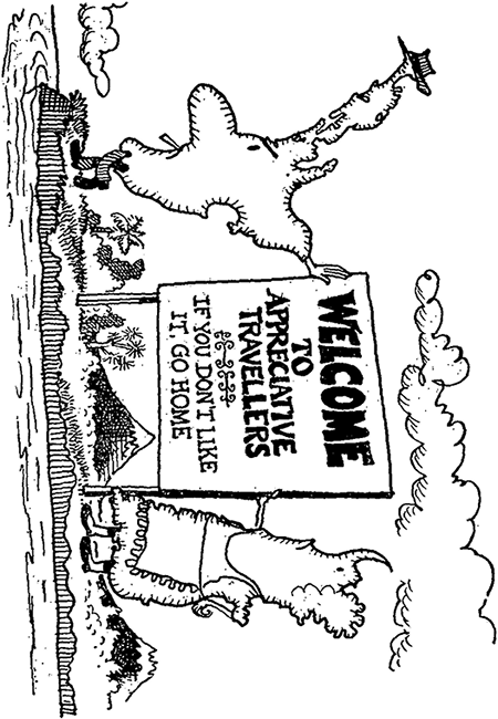 You must make the proper replies. An American matron might get away with saying ‘it’s cute’. An Englishman’s response is, ‘It’s a great improvement on where I’ve just come from.’ This will be either Fiji or Australia, but no one will realise. You could also try, ‘Well, it’s a great place to bring up children.’ This does not commit you to any view and has the added advantage of hinting that you will take early steps to make yourself normal (that’s to say as miserable as the rest) by producing progeny. If you’re still single and the predatory New Zealand girls returning home on your plane have not managed to get their claws into you, then this answer gives a subtle indication that you are suitably ashamed of your unnatural single status and are on the look-out for a decent New Zealand girl (i.e. any).