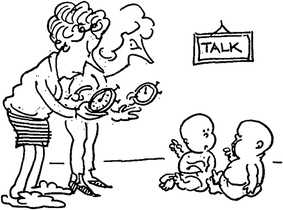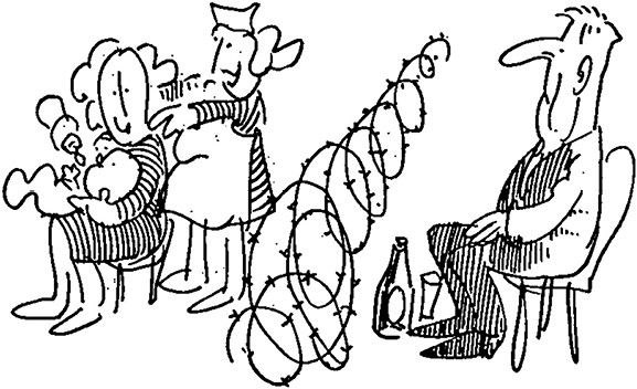In the beginning is the hospital. Babies have to be born there so that regular feeding can programme them to wake Mum at regular intervals and she can be made to feel guilty about such anti-New Zealand habits as sleeping after six a.m. or getting too much pleasure out of a child. Dad’s exclusion from the process of birth and his grudging admission to the hospital conditions him to the view that the whole business has nothing to do with him. His job is restricted to waving rattles before unseeing eyes and going ‘Goo-goo’. Neither his role nor his ability to communicate with his children ever improves much.