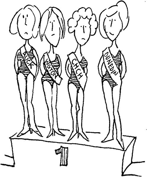 Christchurch is really English only in its social segregation. The ability to sprawl in any direction has allowed segregation by suburb in a way that the hilly sites and the jostling mixtures of Wellington and Dunedin have not permitted. Professionals work in Hereford Street making fortunes and they live in Cashmere or Fendalton (where the camel hair coat went to die). The remaining suburbs are nicely graded. Any estate agent will guide you to the appropriate one once you’ve told how much you can afford to pay over what you can afford to pay. If he suggests Sydenham or New Brighton you should start thinking of a new job. The latter has a run-down atmosphere and gawping icecream-eating crowds doing their Saturday shopping. It also houses more cranks to the acre than any other part of the country.