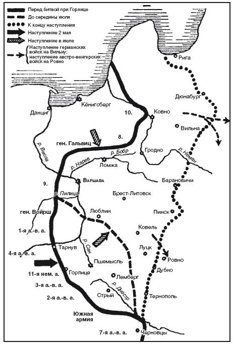 Юго-восточный фланг нами в расчет не принимался, поскольку ведущие туда железнодорожные пути находились в слишком плохом состоянии, что препятствовало быстрой переброске войск. Германский же Восточный фронт находился слишком далеко от основных сражений, и обозначившийся там у немцев успех требовал времени, чтобы оказать оттуда влияние на ситуацию в Карпатах. Поэтому наиболее благоприятные предпосылки для успешных действий наших войск сложились только на участке между населенными пунктами Горлице и Тарнув.