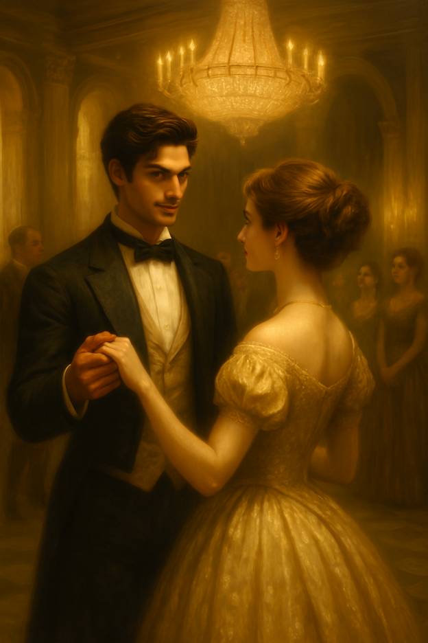 Под звуки оркестра зал наполнился атмосферой настоящей сказки. Золотистый свет свечей отражался от роскошных хрустальных люстр, освещая великолепные наряды гостей. Бархатные и шелковые ткани платьев переливались разными оттенками, а мужчины в элегантных фраках держались с достоинством, словно герои из старинных портретов. Запахи свежих цветов, изящно украшавших зал, смешивались с ароматом дорогого парфюма, добавляя утончённости этому изысканному вечеру.