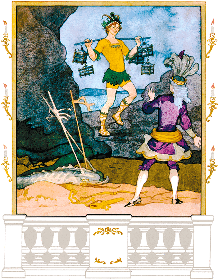 Но тут послышалась весёлая песенка, а затем появился и тот, кто её напевал. До чего же это было забавное существо! Только представьте себе: человек в костюме из разноцветных птичьих перьев! И весь увешан клетками, в которых были птички!