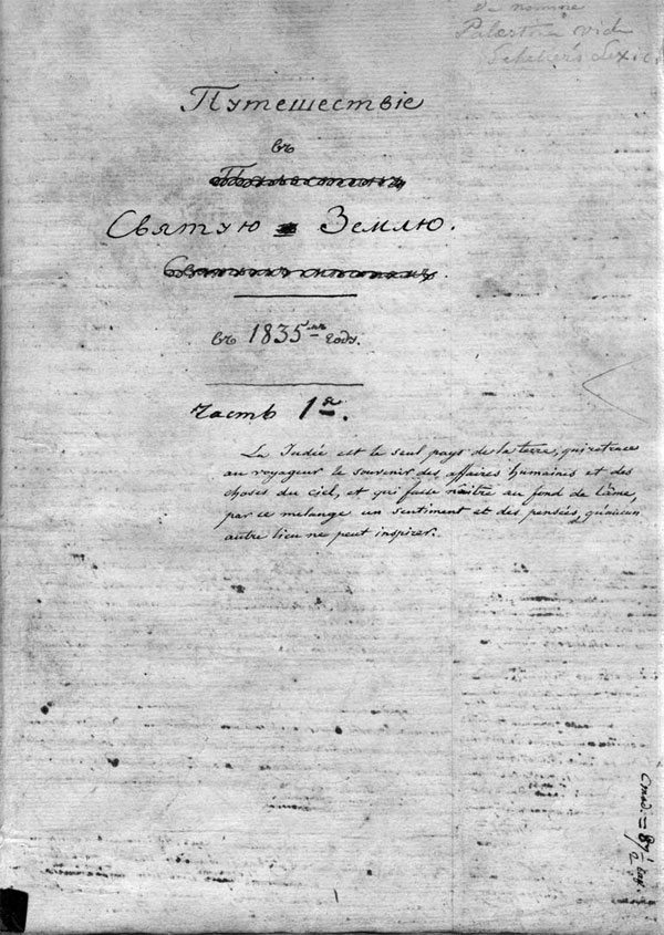 География и топография Палестины, в сравнительном отношении к тексту Священного Писания, доселе еще мало объяснены очевидцами. Я имел отчасти целью облегчить, в этом отношении, чтение многих мест Ветхого и Нового Заветов. В прошедшем столетии Реланд, в нынешнем Раумер оказали важнейшие услуги по этому важному предмету, а из очевидцев (собственно для Палестины) Кварезмий, Маундрель, Рихардсон, Покок и Букингам. Знаменитый Буркхарт, Зецен и некоторые другие, обогатившие нас сведениями положительными о Востоке, исследовали наиболее Аравию и страны заиорданские. Большое число древних путешественников имели в предмете описание одних святынь. Я тогда только пользовался указаниями путешественников, когда находил на месте их показания сходными с текстом Библии. Библия есть вернейший путеводитель по Святой Земле, и я считаю себя счастливым, что по большой части имел при себе во время пути только одну Библию.
