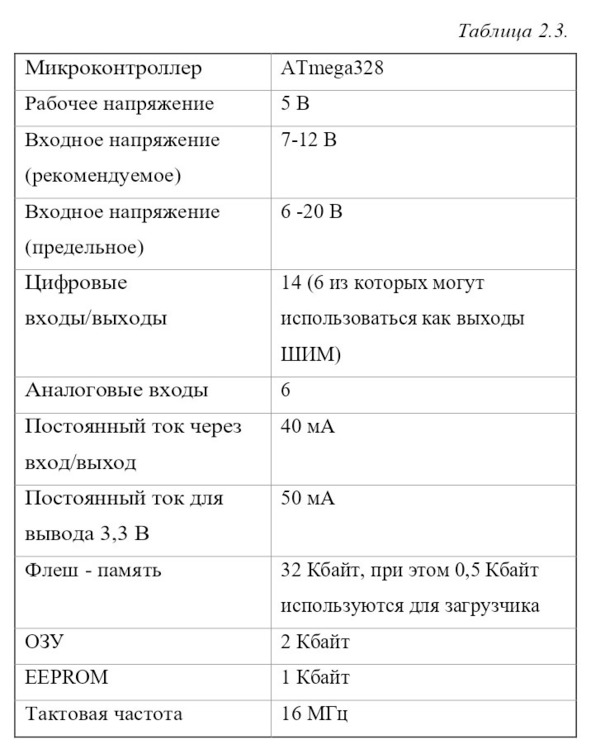 The characteristics of the Arduino Uno board are presented in Table 2.3.