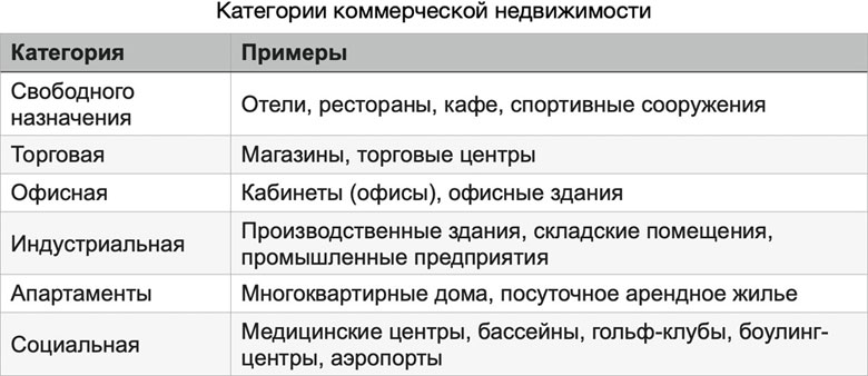 Из представленных категорий только первые четыре имеют непосредственное отношение к коммерческой недвижимости, последние – скорее жилые и социально направленные объекты, использование которых в коммерческих целях может приносить прибыль.