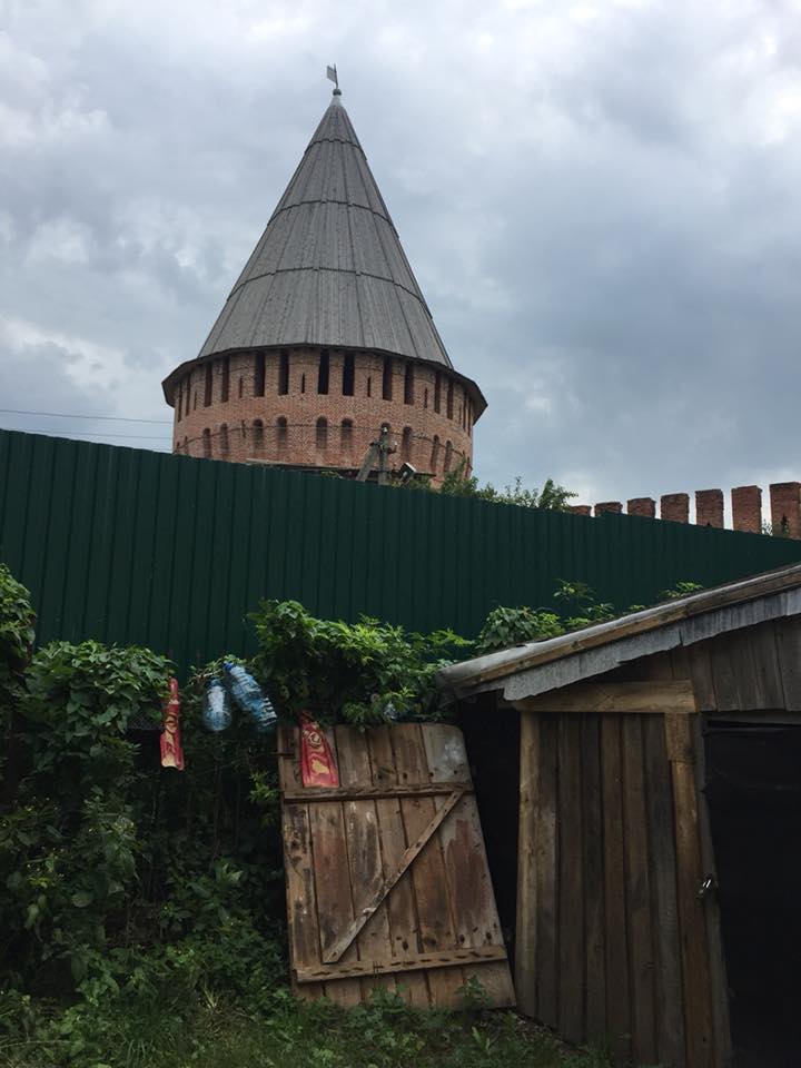 С одной стороны стены – то ли реставрация, то ли реконструкция, виднеется башня крана – эта часть огорожена зелёным металлическим забором. С этой же части практически к самой стене «наприклеивались» самостройные (как самостийные) сараи, валяется покоцанная шина, кажется, старый холодильник (или нечто на него похожее) и развешано для сушки бельё – повседневная человеческая жизнь взяла своё (заборчик, на котором прилажены пустые пластиковые бутылки, как раз отделяет жилую часть от Смоленской стены).