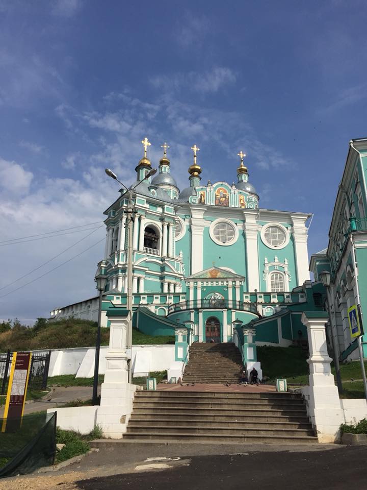 Покатались по городу, прирулили на площадь Победы, тут просто погуляли туда-сюда. «Опалённый цветок» и памятник защитникам Смоленска увидели. Впечатлились. Впрочем, не особо. Съехали с пологой «горки» (видимо, этой «горкой» была центральная и более-менее приличная улица, названия которой я так и не удосужился уточнить1) к подножию Храмов Соборной горы. Бросили машину на «стоянке» (на «прямоугольной» разметке для авто) перед бронзовой статуей Кутузова, стоящей на постаменте из розового мрамора в окружении квадрата живых цветов. И двинулись вверх по соборной лестнице к необыкновенному чуду. Чудо – это Успенский Кафедральный собор, особо не пострадавший ни в период Наполеона, ни в страшный год оккупации Смоленска немцами. Храм, конечно, великолепен изнутри, но снаружи – ещё величественней. Языками от восхищения мы поцокали, но про себя, мысленно.