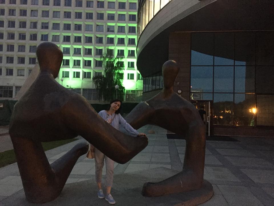 Делаю первое фото супруги на фоне «Планеты». Второе – поодаль, рядом с двумя какими-то «футуристическими» фигурами, протянувшими навстречу друг другу то ли руки, то ли ноги. Плоскость здания за спиной супруги – в ярком пятне изумрудно-зелёной подсветки. Кажется, фоном служит другая гостиница, не помню её названия (но кто-то по фото наверняка узнает и знакомым «пейзажам» обрадуется).