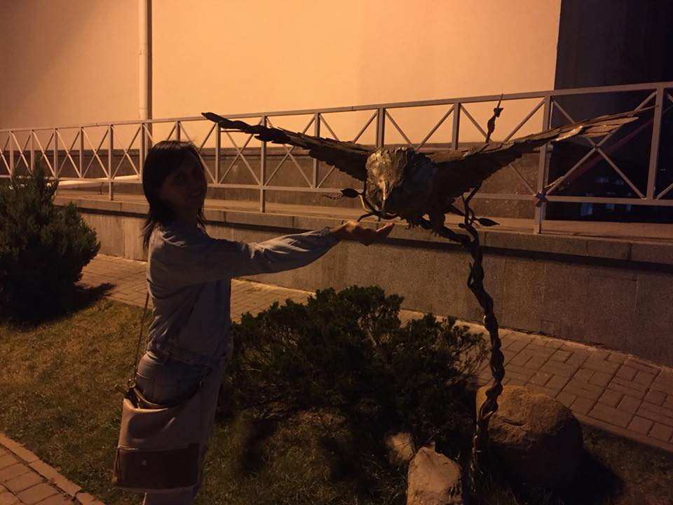Ба! А вот и чешуйчатая металлическая птичка возле церкви Святого Духа. Впрочем, для птички она чересчур велика. Пусть будет птица. Или матёрая «птичища»! Орёл! Или орлица – дилетанту-неорнитологу сложно определить пол пернатого. «Раненая птица в руки не давалась, раненая птица птицей оставалась». Впрочем, птица была не раненая, а чугунная, в крайнем случае – бронзовая. Ан нет! Не бронзовой, не раненой, а кованой (легко и приятно совмещать-склеивать «тёплое с мягким»)! А значит, всё-таки чугунной. Из числа тех «сакральных скульптур», которым в Минске несть числа. Впрочем, все они счётны. Можно поперечислять: «Войт/глава магистрата с ключом» («с ключом и сыну ключ сумел доставить»), «Городские весы», «Незнакомка», «Ассоль», «Прикуривающий», «Дама с собачкой», «Фотограф», «Лошадь и воробей», «Торговка семечками» (она же – «Баба Рая»). Продолжать не буду, ибо перечисление почти закончил. Но большинство из списка «сакральностей» мы с женой не увидели: мимо не проходили, не пробегали и рядом не постояли. Из того, что проходили и видели – это памятник главе Магистрата (собственно говоря, на него взирали прямо из «Гамбринуса») и «Городские весы» (эти как раз напротив ресторана «У Ратуши», куда нас норовила заслать-сбагрить Ира Мальгина, чтобы мы поэкономили и послушали там живую музыку).