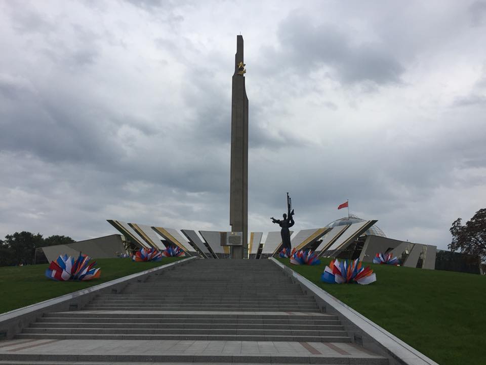 Поднимаемся по лестнице на искусственный курган. Над нами – десятки метров Стеллы со звездой чуть пониже самой верхотуры. Звезда обрамлена веткой то ли дуба, то ли лавра. Мемориальная доска у подножия Стеллы. На самом деле обелиск – это развёрнутое знамя Победы. Масштаб впечатляет. Вокруг много воздуха, чувствуется простор, раздольные минские пространства. Как принято говорить, атмосферно! И какой же белорус не любит быстрой езды!