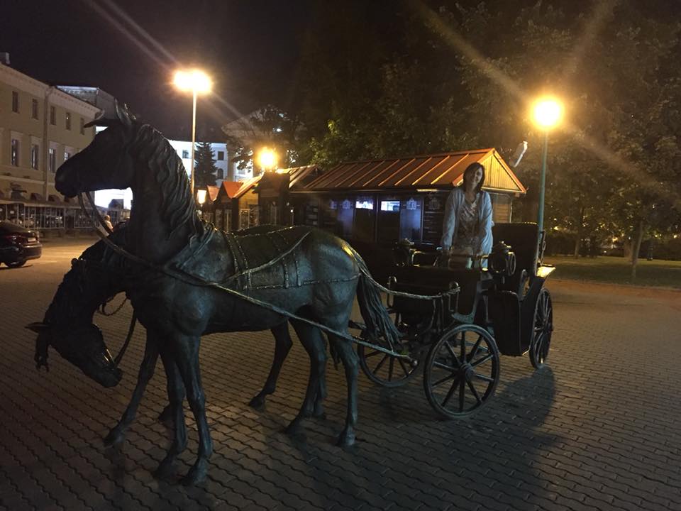 Ну, как же, выпивши, не сфотать супругу на фоне Ратуши, тем более, что жена и сама была дюже горазда попасть в объектив моего мобильника. А уж если снимать, то непременно в чугунной (?) карете с «парой гнедых» («Что ж вы плетётесь усталой рысцою, пара гнедых, ай да пара гнедых?»). Эээ, впрочем, «гнедые», судя по расположению их «обутых в копыта» ног, даже не плелись, а просто… стояли «пешком»: одна из лошадей даже опустила голову, видимо, «фырчала» от недовольства (или неудовольствия). Официально эта скульптура носит название «Экипаж» или «Губернаторская коляска». Жена побыла в роли «калифа-на-час», то бишь «губернаторши».