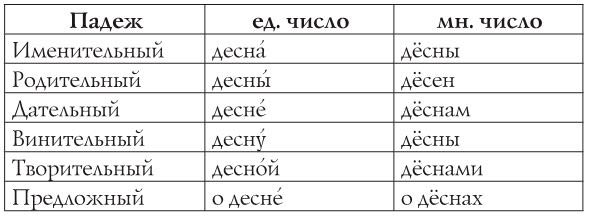 Аналогичное затруднение возникает и при образовании именительного падежа множественного числа существительного «десна́». Дело в том, что в разговорной речи можно часто услышать: «У моего сына чешутся десна́» с ударением на —а. Правильно ли так говорить с точки зрения морфологической нормы современного русского литературного языка? Чтобы узнать правильный вариант, изменим слово «десна» по падежам и числам: