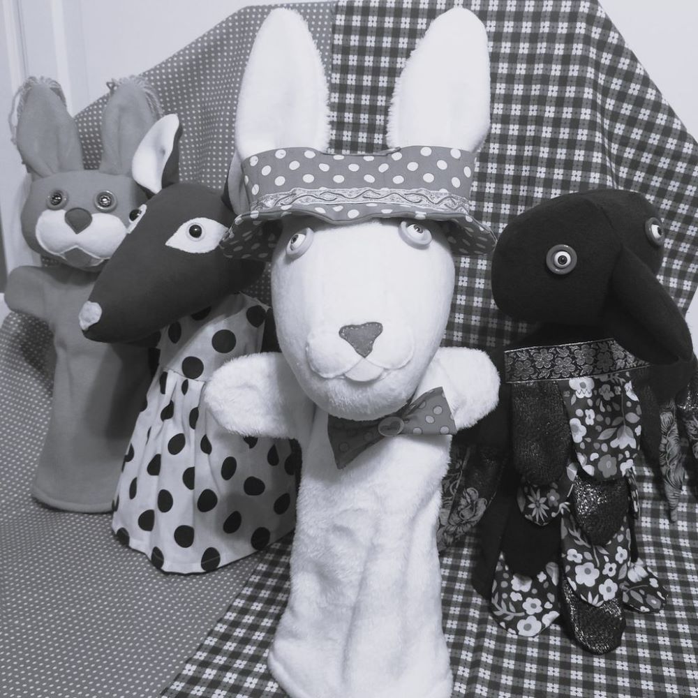 Зайчишка пропадает в траве. Потом появляется вновь. Он держит куклу.